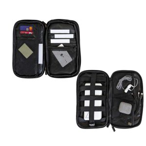 V notranjosti sta dva prekata namenjena za shranjevanje tehnoloških dodatkov: kabli, polnilci na eni strani, na drugi strani pa so zavihki in žepi za shranjevanje dokumentov.