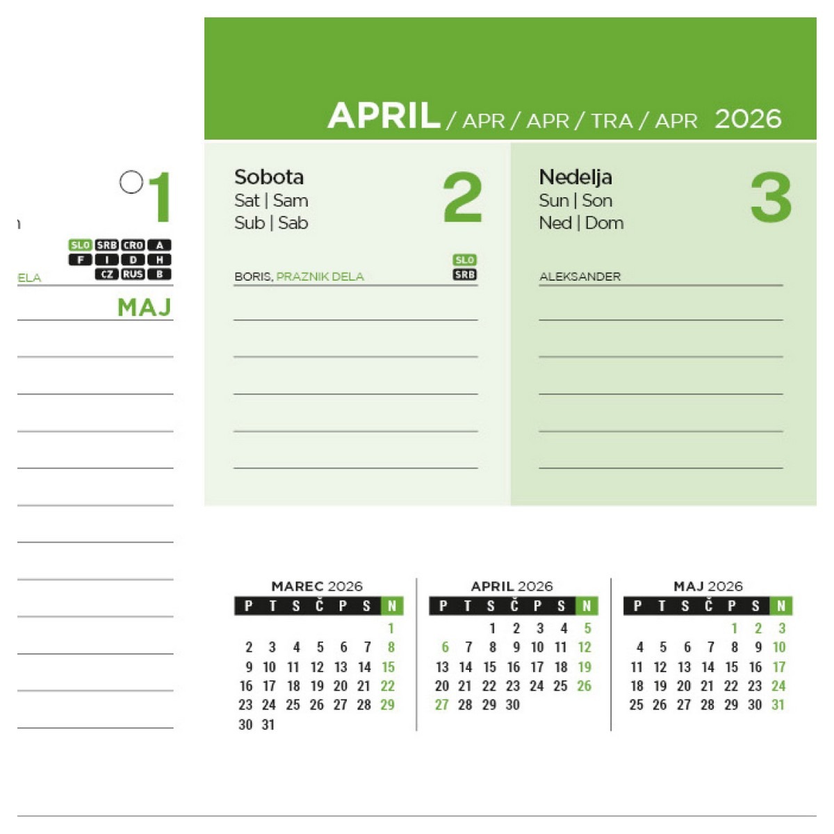 Koledar NAMIZNI POKONČNI POSLOVNI ZELEN 2026