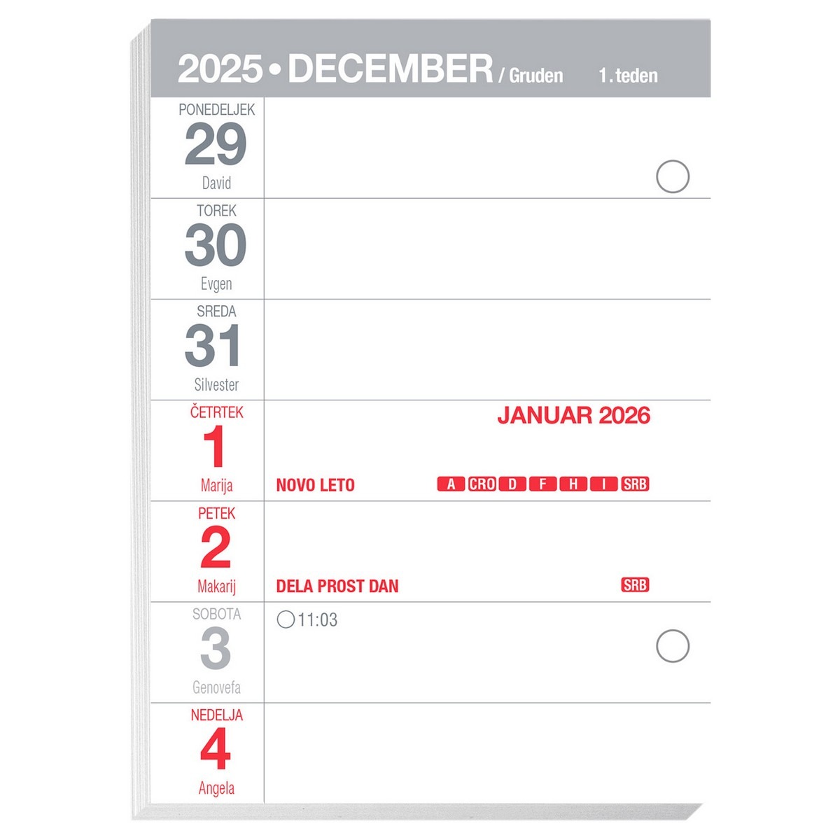 Velikost: 100 x 140 x 5 mm Tedenski koledar
