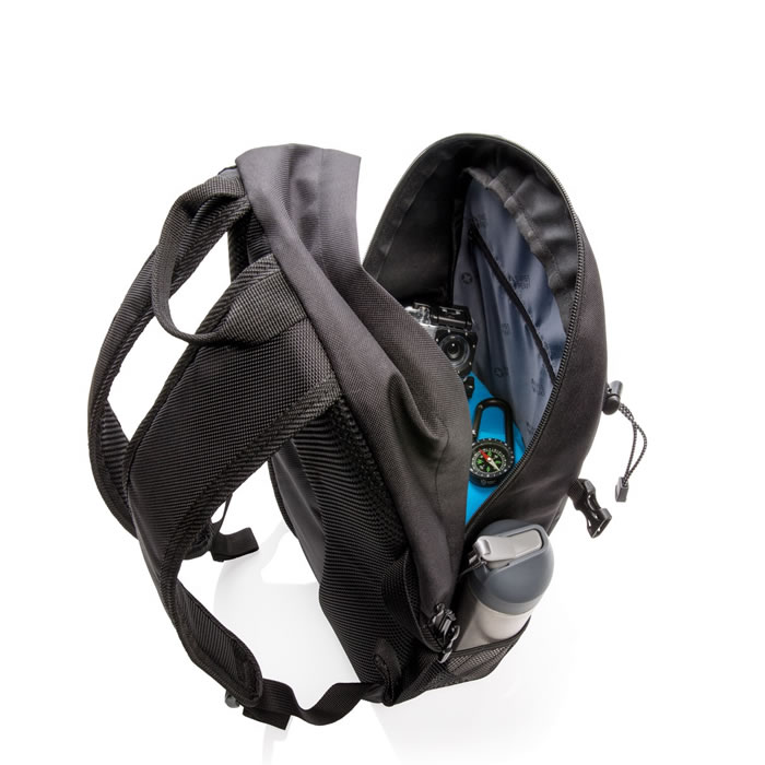 Nahrbtnik iz 600D in 1680D poliestra z velikim glavnim predelkom je idealen za uporabo na prostem. Hrbtna stran je oblazinjena in zagotavlja udobje. Stranski mrežni žepi za shranjevanje stekleničke z vodo ali dodatne opreme. Brez PVC.