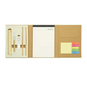 – 50 listni črtast notesnik, 2 x natur grafitni svinčnik, 1x papirni eko kemični svinčnik, leseno 15cm ravnilo, šilček, radirka, set 5 barvvastih post-it samolepillniih lističev + rumeni post-iit blokec