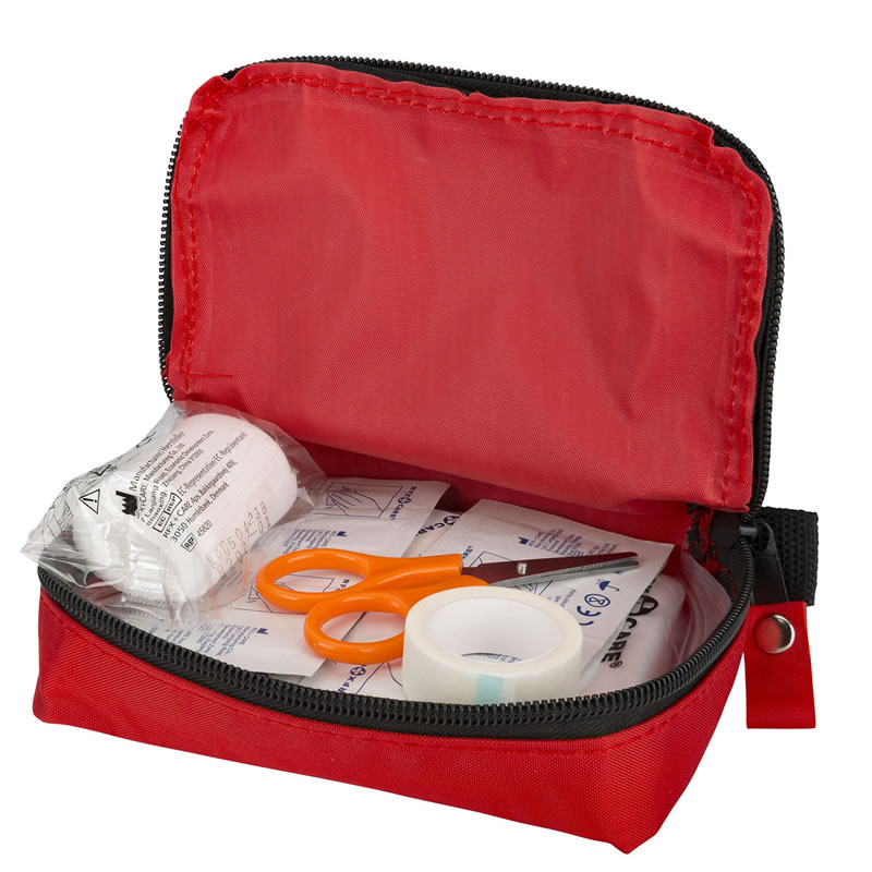Torbica z enim sprednjim žepom, enim črnim glavnim predelkom z zadrgo in pasno zanko na hrbtni strani torbice. Vsebina: Trikotni povoj, prvi povoj, alkoholna blazinica, obliži, škarje, sponka in lepilni trak, v skladu z EN 13485:2003.